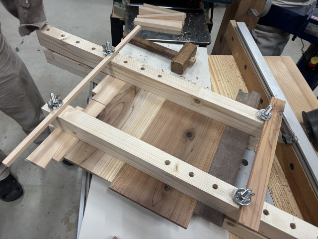 後は蓋を作れば完成ということろまできたので、最近作った板矧ぎ用治具を使って、蓋にする板を矧ぎました。これ、とても使いやすい。