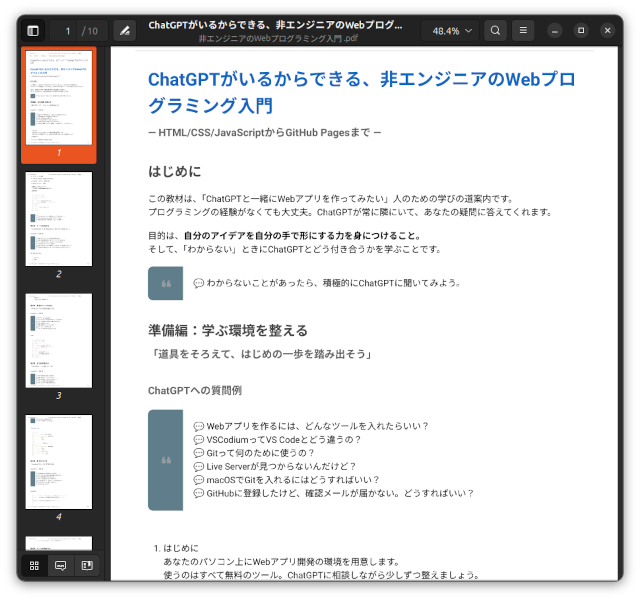 よくある初心者向けの教材では「メモ帳を作ってみよう」みたいにテーマが決まっていて、教材をなぞっていくとアプリが完成するという構成ですが、この教材では作るものはWebアプリというだけで、何を作るかは学習者に委ねています。つまり自分で決めないと始まらない教材です。それでも迷子にならないように、ChatGPTにどのように聞けば前に進めるかを記載しています。