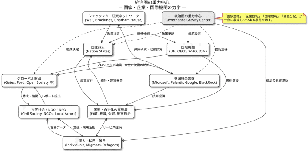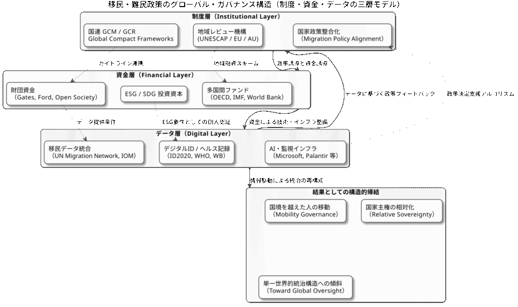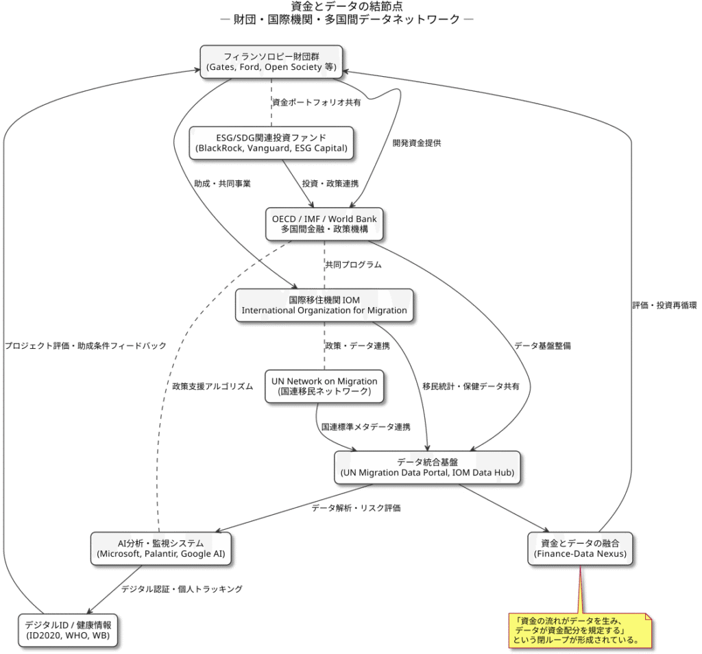 下段のデータ層(Digital Layer)では、IOMやUN Migration Networkによる移民データ統合、ID2020やWHOなどが主導するデジタルID・ヘルス記録、そしてMicrosoftやPalantir等が関与するAI監視インフラが含まれる。これらの技術基盤は、資金層で生まれたプロジェクトを支える一方で、政策評価や国際比較に必要なデータを提供し、再び制度層へとフィードバックされる。