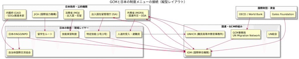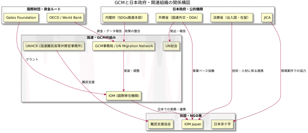 法的拘束力はありませんが、国連・国際移住機関(IOM)・各国政府・民間財団・NGOが連携し、「人の移動」をデータや資金の流れで調整していく仕組みを持ちます。