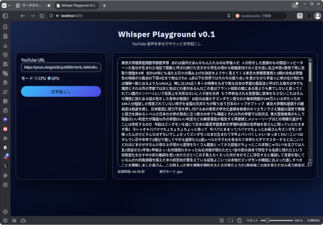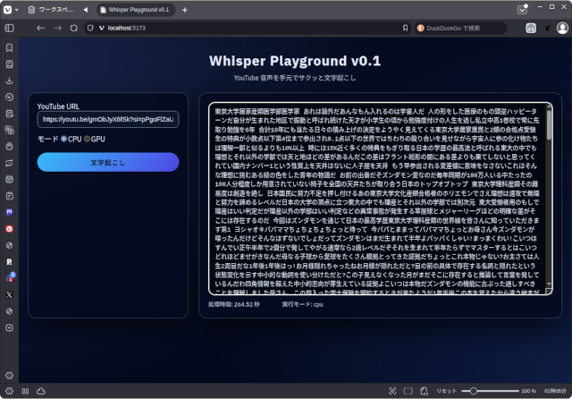Whisperという文字起こしAIを使って、YouTube動画の音声を文字起こしするオモチャを作りました。