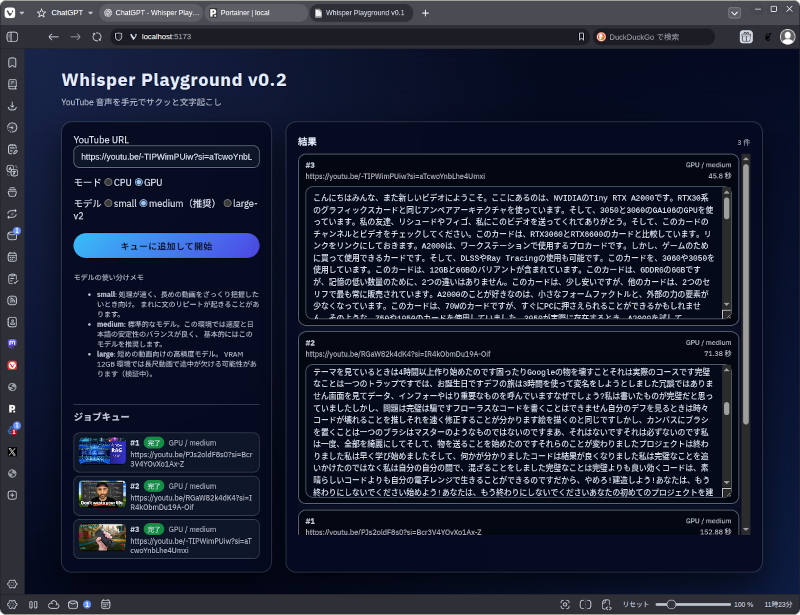 Whisper Playground v0.2への拡張 2025年11月30日 by kazuo.tsubaki 文字起こししたデータのファイル保存と日本語への自動翻訳機能を追加しました。上のスクリーンショットは英語の動画を文字起こししたときのもの。 翻訳は後からいくらでもやるので、自動翻訳はやらなくても良いような気がしています。 v0.1の記事はこちら。