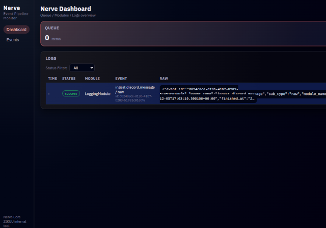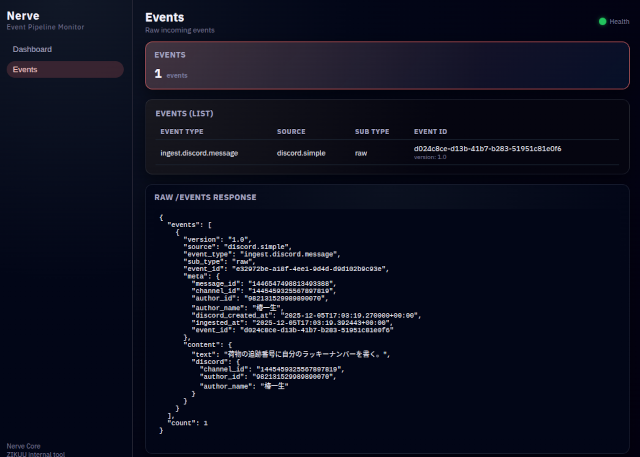 Nerveは、Ingesterとパイプラインの間にいて、Ingesterから投げ込まれたエベントをキューにいれ、並列動作するパイプラインに処理を渡します。現時点では、今回作ったIngesterから受け取ったイベントをログパイプラインに流しただけ。