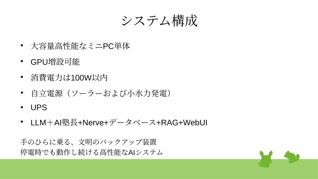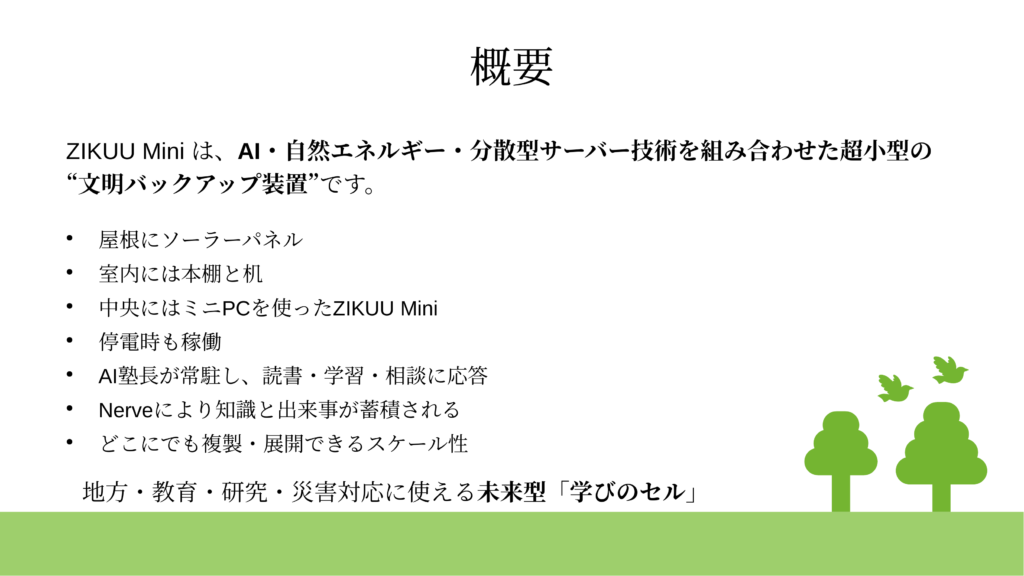 そこには、省電力のミニPC1台にZIKUUのすべてを詰め込んだ、手のひらに乗る小さな文明装置と本棚とテーブルが置かれます。電気はソーラーパネル発電または小水力発電によって賄われ、部屋の外では、モノづくりができる。これがZIKUU Miniです。これは上の図の要素がすべて揃った環境のコピーです。