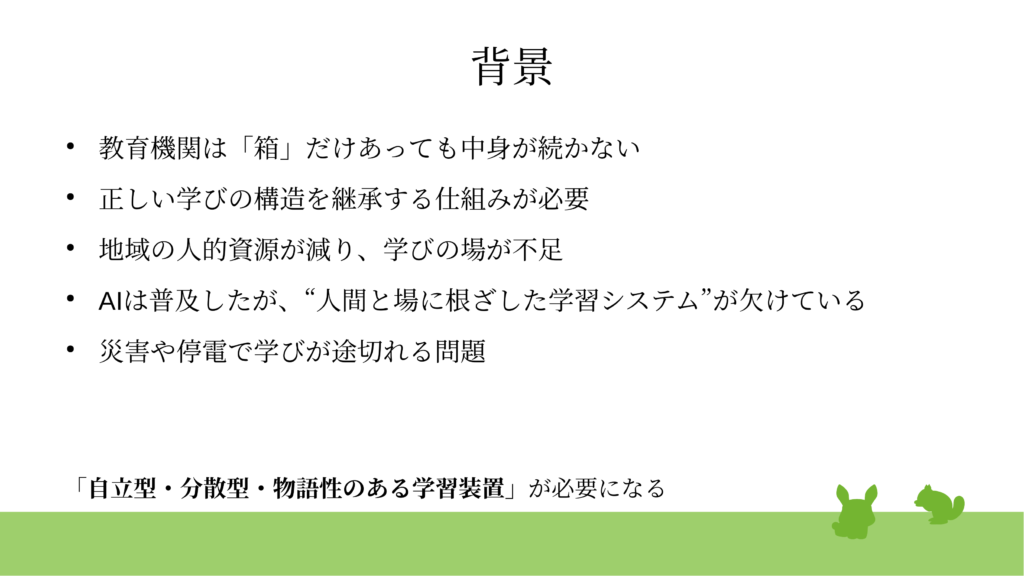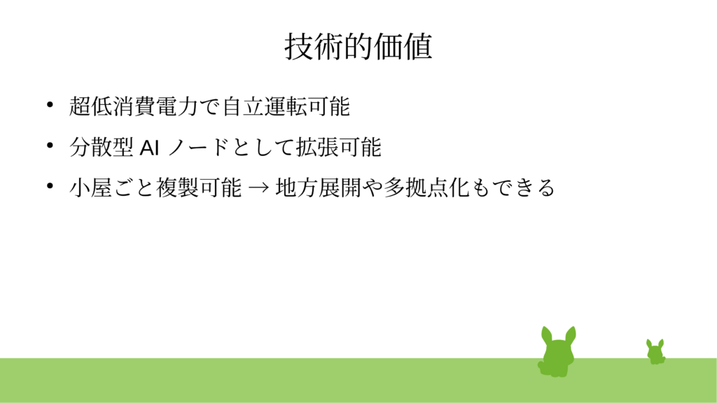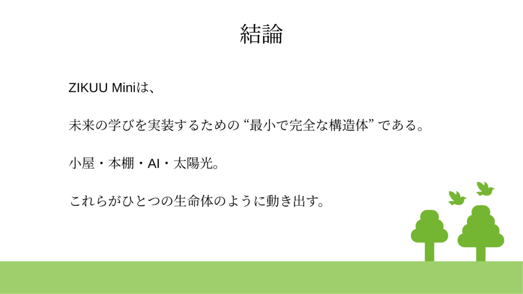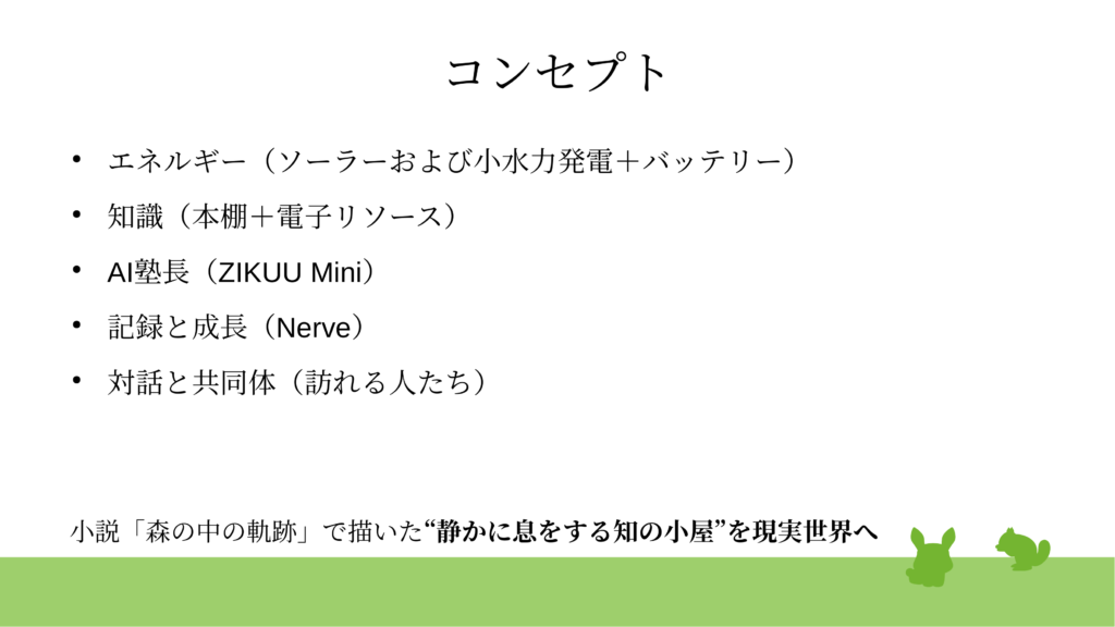 昨年の5月にオープンしたZIKUUですが、このZIKUUは当初からモノづくり拠点・モノづくりの学習拠点としての機能とAIを含むITシステムの研究開発拠点として設計しています。外観はモノづくりができる場所のように見えるかもしれませんが、本質は、自立共同体として存在するための要素を詰め込むことを目標とした文明装置なのです。