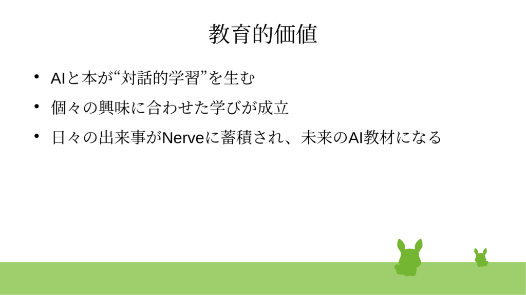 以前の投稿でも紹介しましたが、ZIKUUは、下の図のうち、身体性(生産技術と設備)、精神性(基礎教科書や小説)、神経系(Nerveというイベント駆動型情報伝達装置)がすでに揃い、ここから1年ほどの期間で頭脳(AIシステム)を完成させます。これが第一次ZIKUUの完成形です。