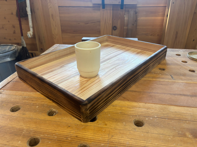 杉板の色も嫌いではありませんが、物足りない気がしたので、側板だけ焼いてツートーンにしました。仕上げは蜜蝋を刷り込んで磨いただけです。