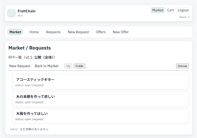 今日は、FruitChainにログイン機能とRFP (Request For Proposal) =モノやサービスの提案依頼を作成する機能を追加しました。