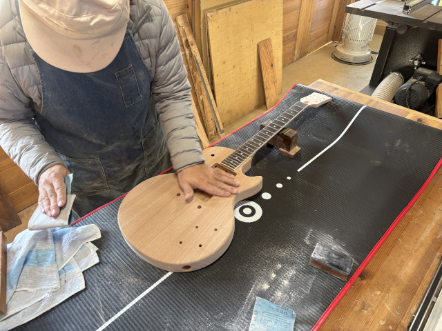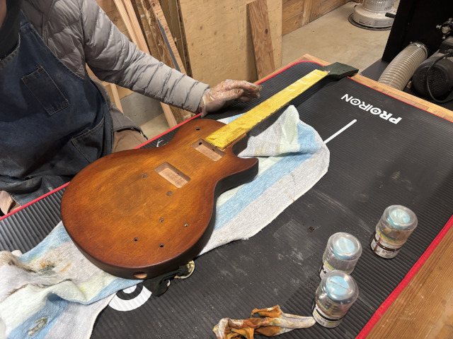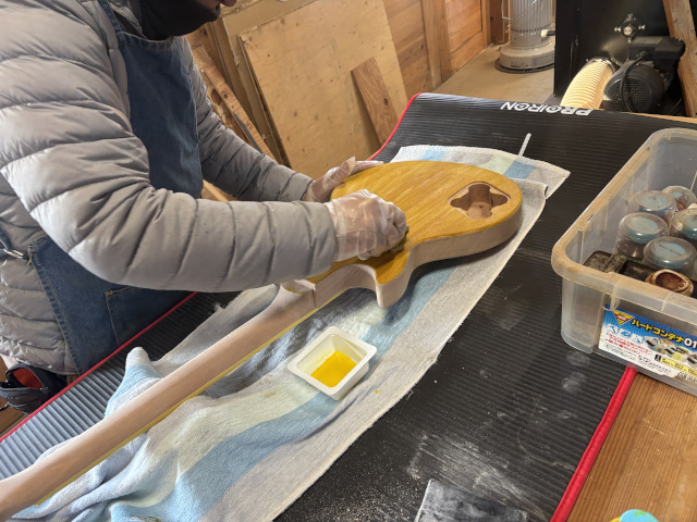 今日は、ギター製作を学んでいる塾生がきて、製作中のギターを着色しました。