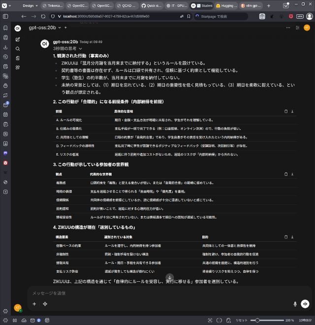 試しに、問題行動の分析をさせてみましたが、プロンプトエンジニアリングの結果、ChatGPT 5.2の近い結果が出ます。推論速度もまあまあ速くて50 token/sほど。対話用として使用しても十分な性能が出ています。1世代前のA4000と変わらない結果が出ました。これで続きの開発が進められます。
