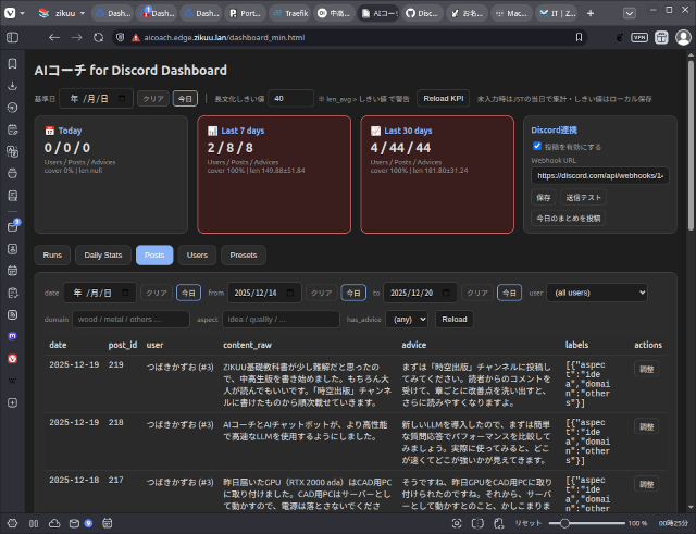 AIコーチの方は、Discordチャネルに書き込んだその日の出来事に対してアドバイスをするものですが、こちらは、以前より質の高いアドバイス文が生成されるようになりました。