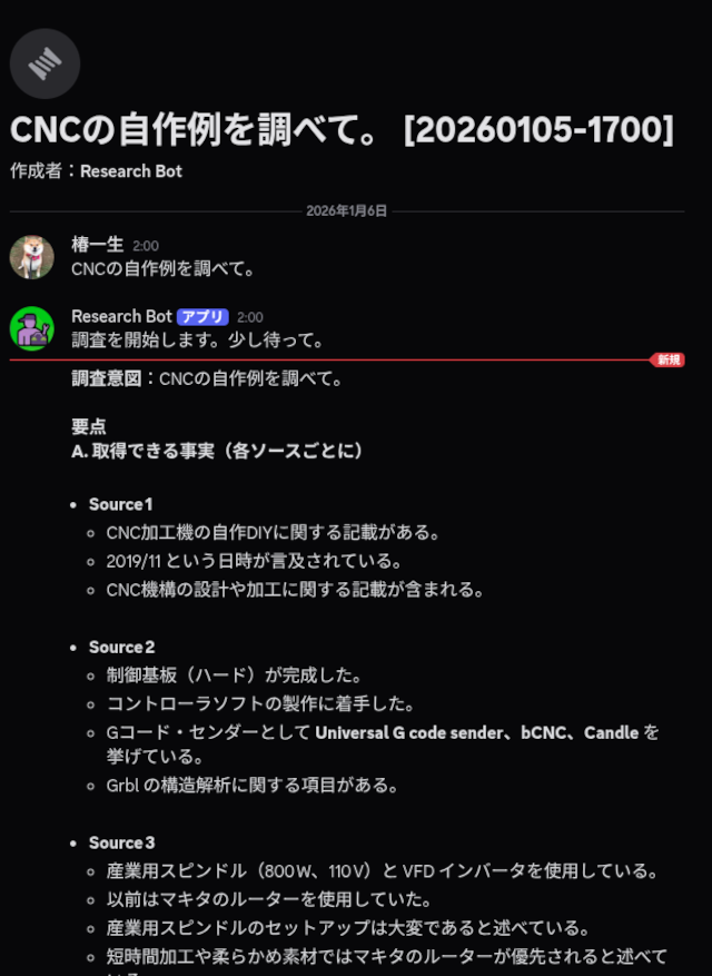 所定のチャンネルで質問を入力すると、Web検索->Discord新スレッド作成->LLMによる文章生成をやってくれるボットです。