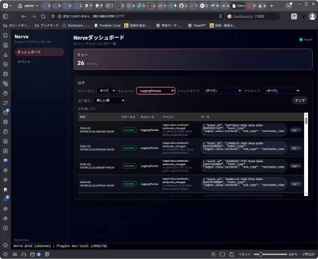 これはNerveが処理中のパイプライン。26本のパイプラインがキューに乗っているが見えます。