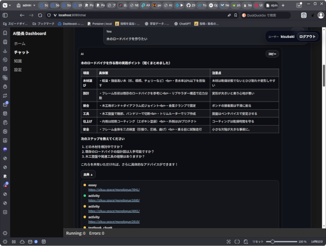 雑談モードで「木のロードバイクを作りたい」と入力した場合はこんな回答が返ってきます。