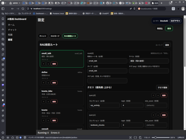 雑談したい、一般知識が欲しい、定義を知りたい、ノウハウを知りたい、とにかく相談したい、みたいなケースごとに検索ルートを作りました。その設定を触れる画面が上のスクリーンショット。Qdrantコレクションをどの順番で辿るかを定義できます。