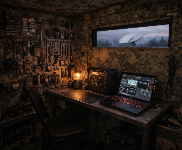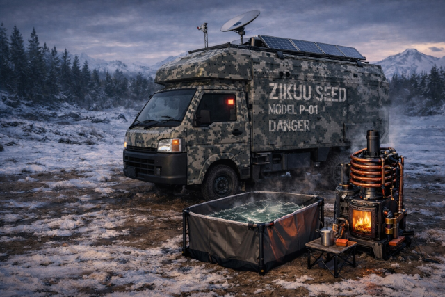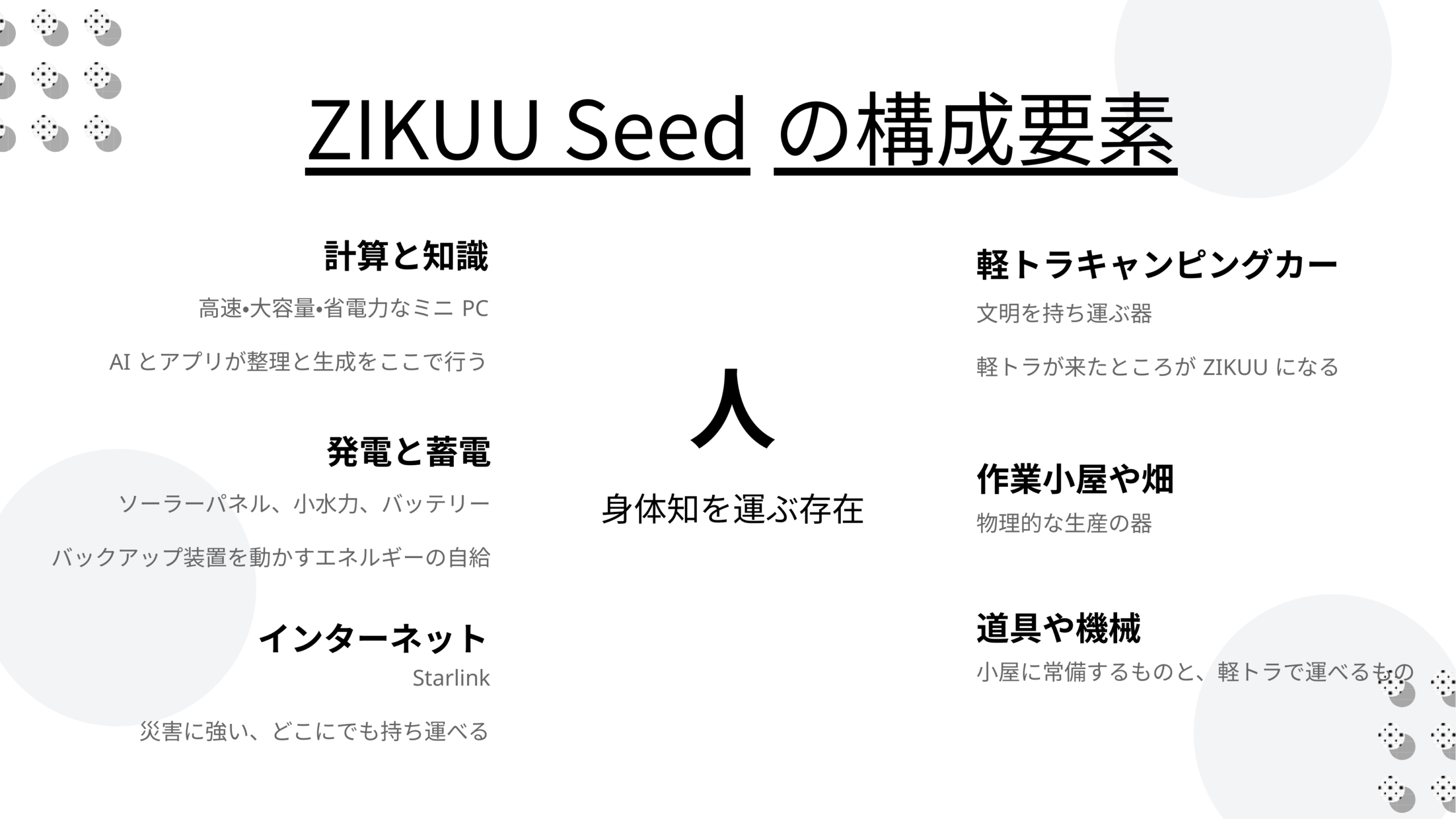 ZIKUU Seedは軽トラで移動可能なZIKUUで、移動先が即座にZIKUUになり、生活、情報収集、モノづくり、研究を継続するための生存戦略として設計されています。