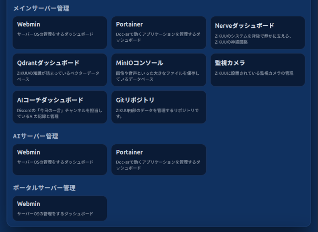 これらはすべてWeb UIを持ったアプリケーションで、これらの他に、軽量な認証サーバー(自作)、リレーショナルデータベース、Discordをインターフェースにしたアプリケーション(ボット)が5つほど動いています。
