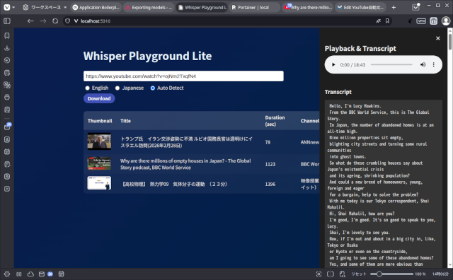 すでにWhisper PlaygroundというYouTube動画から文字起こしするアプリケーションを開発していますが、その軽量版をローカルLLMを助手にして開発していました。