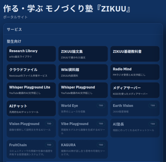 今日の時点で、残る開発プロジェクトは、World Eye(国際ニュース収集・分析アプリ:開発中)、Earth Vision(JAXA APIを使った地球観測アプリ:未着手)、Vision Playground(画像解析アプリ:ほぼ完成)、Vibe Playground(環境データの解析アプリ:少しだけ進捗)、AI塾長(半分くらいできている)、FruitChain(共同体経済システム:設計のみ)、KAGURA(LLMの思考過程を可視化するアプリ:コンセプトのみ)という状態。ZIKUU v1.0にはVibe Playground、FruitChain、KAGURAを含めていないので、アプリケーションはあと4つ、それ以外に、知識化パイプラインが10本くらい、Discordボットが2本くらいが残っていることになります。