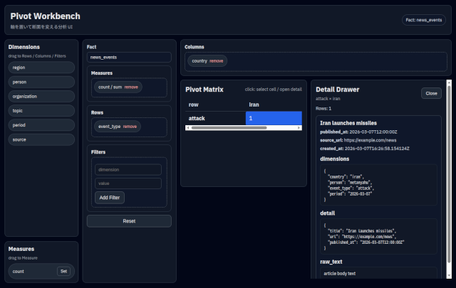 国を列軸に、事件のタイプを行軸にドラッグ&ドロップすると、列軸 x 行軸で絞り込まれた記事が出てくる。
