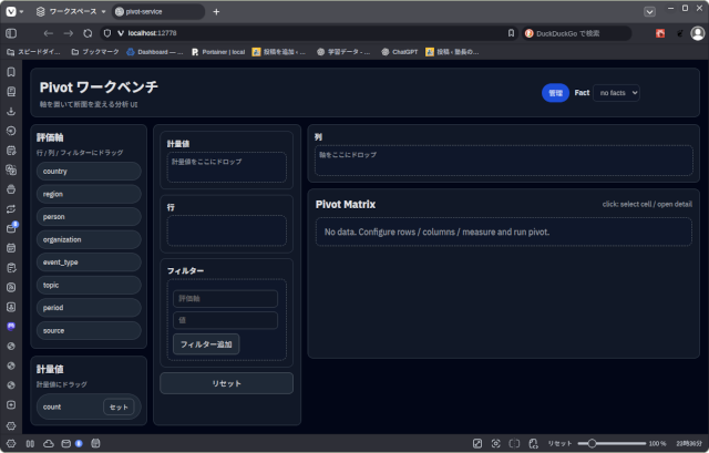Nerveはデータの整流機(システムの神経回路)であるのに対して、Pivot Serviceはデータの観測窓という位置づけで、どちらもZIKUUで扱うあらゆるデータが通過し、AI塾長や他のアプリ(World EyeやEarth Visionなど)が利用する重要なレイヤーです。