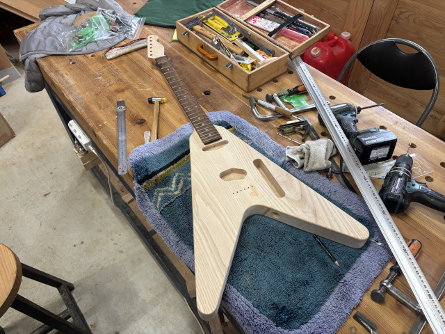 今日は塾生がテレキャスターネックとフライングVを合わせたギターの、ネック取付部の加工をやりました。