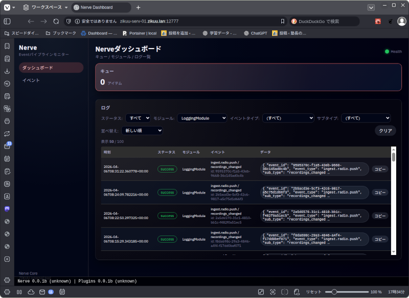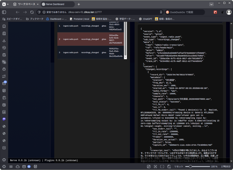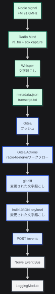 昨日はRadio Mindでラジオ放送の自動文字起こしデータをGiteaのリポジトリに保存するころまでやりました。今日は、Git Actionsを書いて、リポジトリに保存された文字起こしデータをNerveに送信する機能を実装しました。