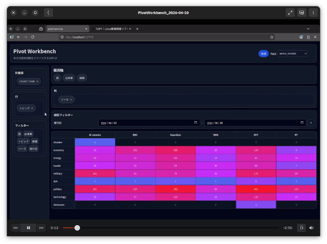 Pivot WorkbenchのUIを調整する〜Pivotサービス 2026年4月10日 by kazuo.tsubaki ドラッグ&ドロップで気持ちよくPivot操作ができるように、UIをチューニングしました。 動作の様子はこちら↓のYouTube動画でご覧になれます。