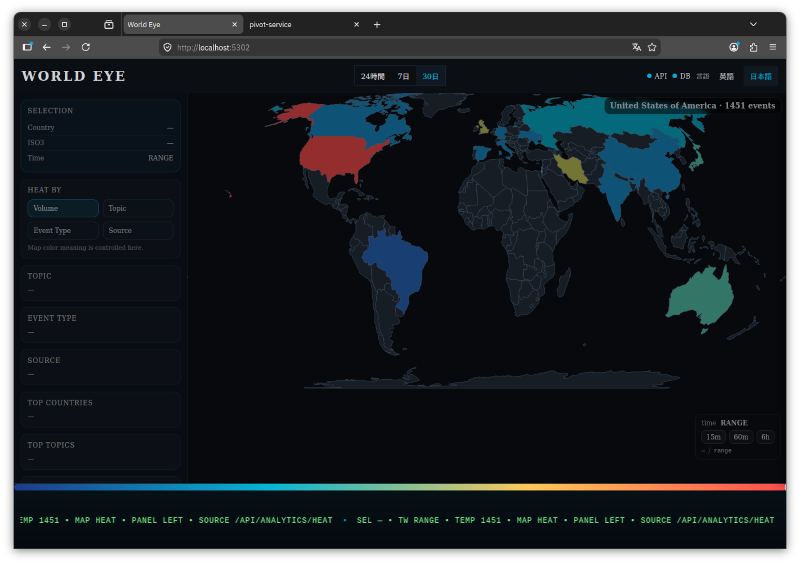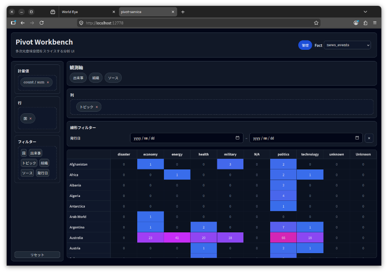 Pivot Serviceが大方できたので、World EyePivot Serviceが持っている国際ニュースのFactを表示する薄いクライアントアプリとして作り直しています。それが上のスクリーンショット。