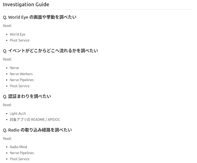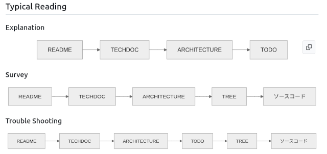 システムの説明なら、機能拡張の際に調査なら、トラブルの原因究明なら、この順番で読めという指示です。