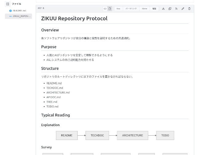 各ソフトウェアのリポジトリには、ZIKUU Repository Protocolという規約に従って、いくつかのファイルが置かれます。