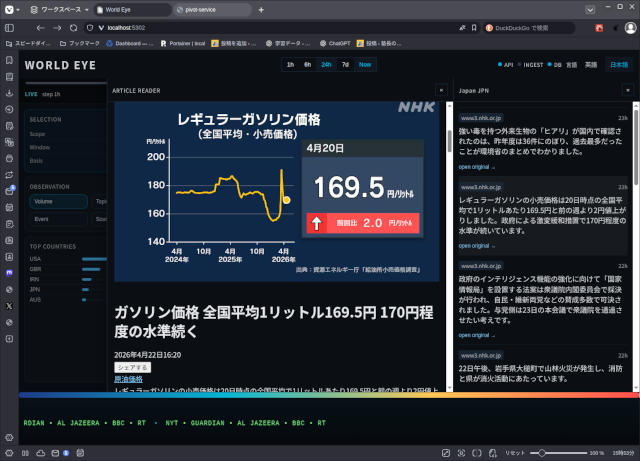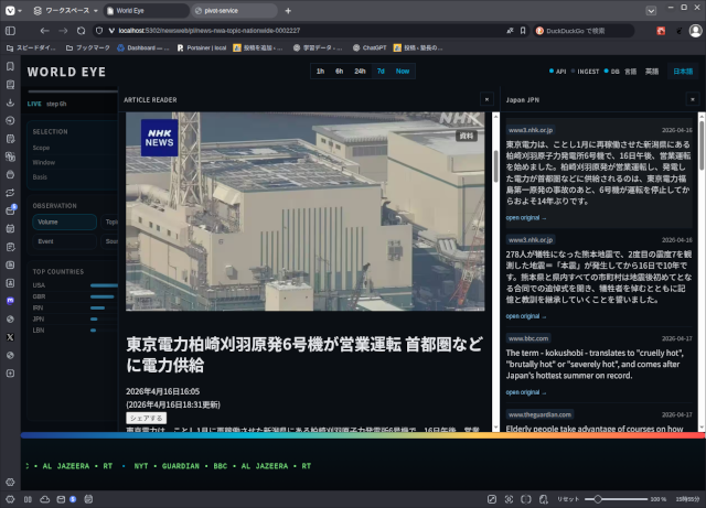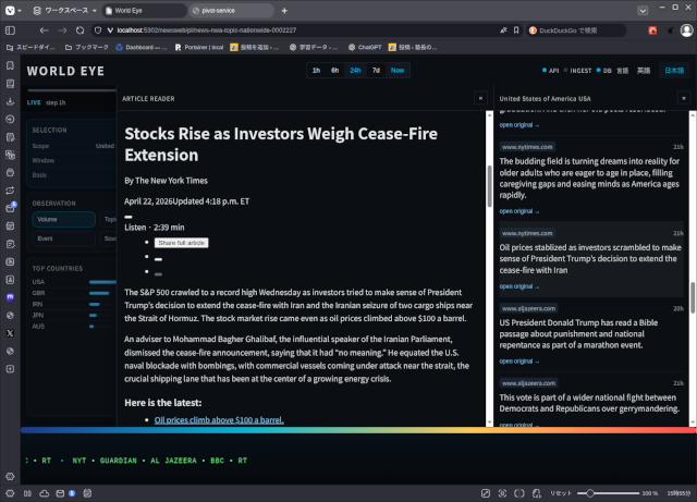世界地図に国際ニュースがマッピングされて温度を観測できるようになったので、次は個別のニュースを読めるようにします。