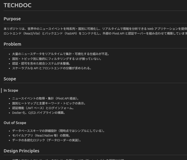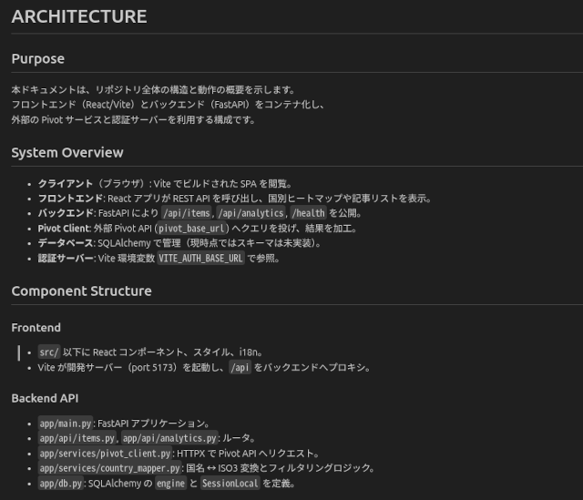 と聞くと、README → ARCHITECTURE → TREE → ソースコードの順に読んで、修正案を提示し、