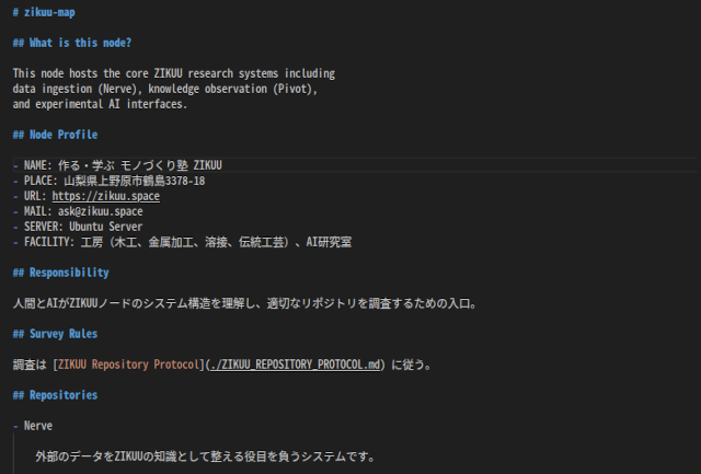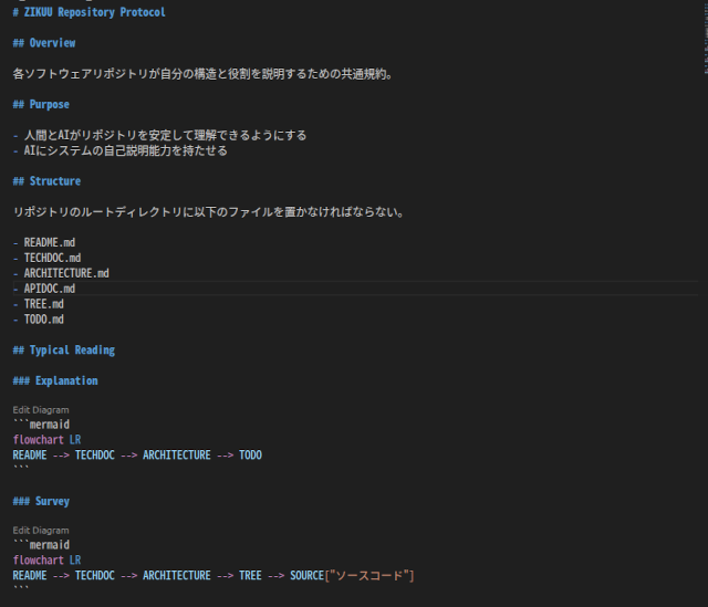 各リポジトリはZIKUU Repository Protocolという規約に準じたファイルを持ち、何をどの順番で読むべきかの指示をRepository Explorerに与えます。